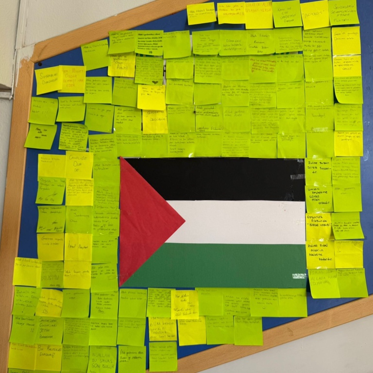 Ayrıca okul panosunda, öğrencilerin barışa ve insan haklarına dair dileklerini ve düşüncelerini içeren notlarla çevrili bir Filistin temalı farkındalık köşesi hazırlandı.